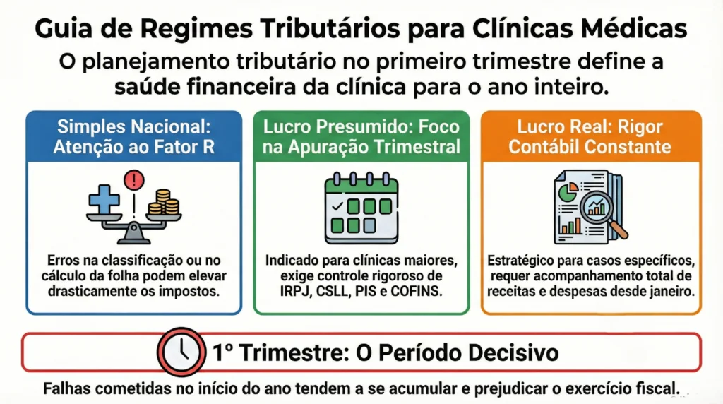 | Lucro Presumido | Clínicas médias | Trimestral | Primeira apuração define o ano |